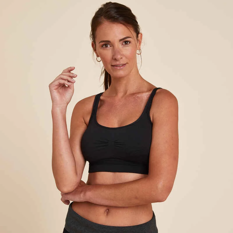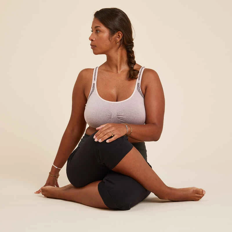 Pour les yogas doux, nous avons créé cette brassière sans coutures, à base de coton issu de l’agriculture biologique et viscose pour un confort plus douillet.