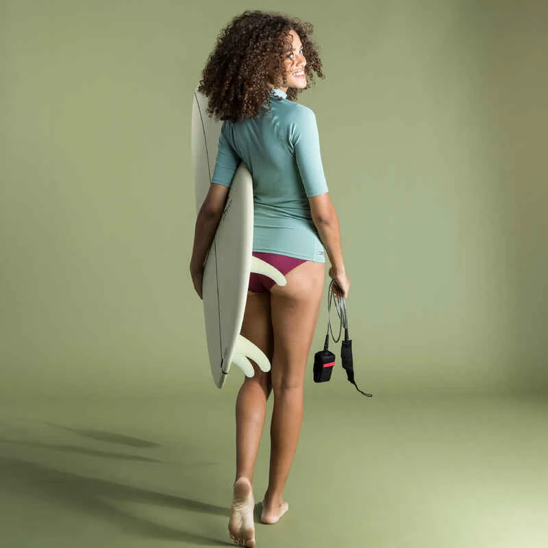 Nous, surfeuses de tous niveaux, avons conçu ce tee shirt anti UV pour la surfeuse débutante qui surfe les mousses.